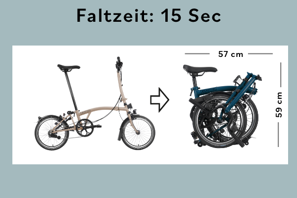Der Faltmechanismus eines Brompton ist so genial, dass sich das Rad in 10 bis 20 Sekunden zu einem handlichen und tragbaren Paket zusammenfalten lässt. Dabei legen sich die Kette und die Gangschaltung nach innen, um beim Tragen die Kleidung nicht zu beschmutzen.