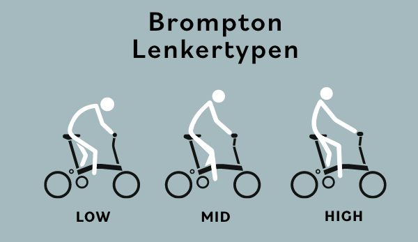 Alle Brompton Falträder sind mit drei (bzw. zwei beim Brompton Electric) verschiedenen Lenkertypen erhältlich, die sich für unterschiedliche Fahrpositionen und –stile eignen.