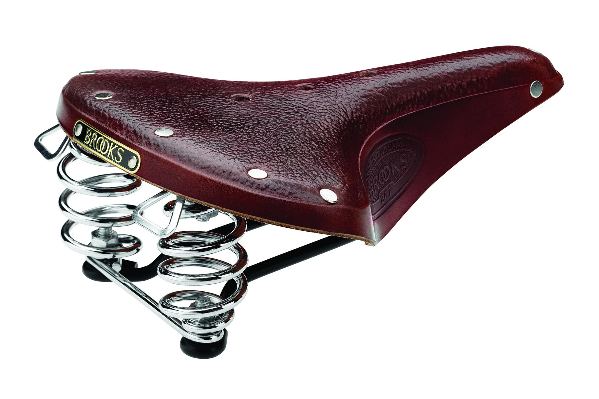 Der B67 bietet ein besonders bequemes Fahrgefühl durch die Federung: Ideal für die tägliche Nutzung und auf langen Touren. Hier die etwas kürzere "S" Variante für Damen. Wie alle Brooks Sättel wird auch der B67 in England auf traditionelle Weise gefertigt, auf den Original BROOKS Maschinen. Mit silberfarbenen Stahlnieten und schwarzem Stahl-Gestänge.