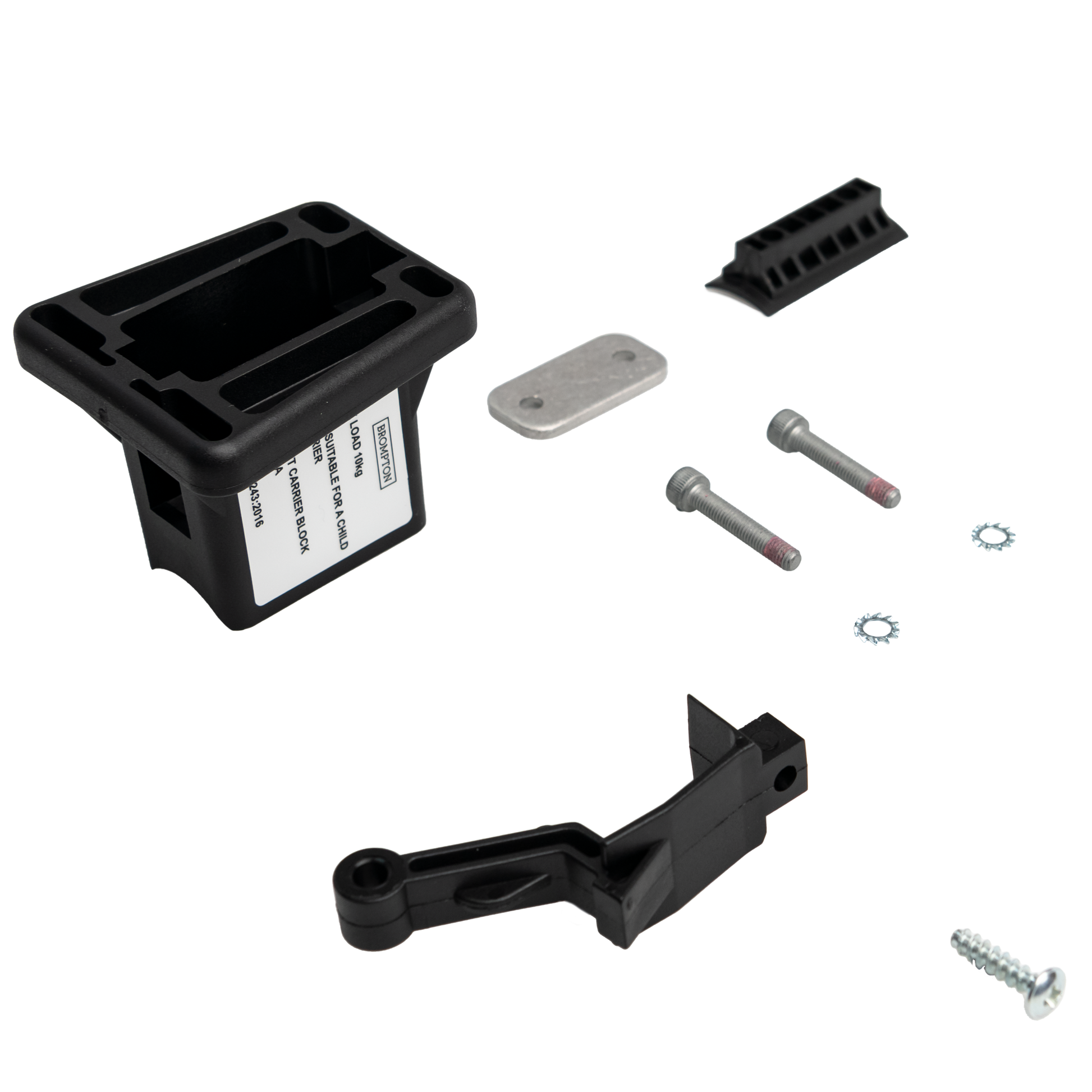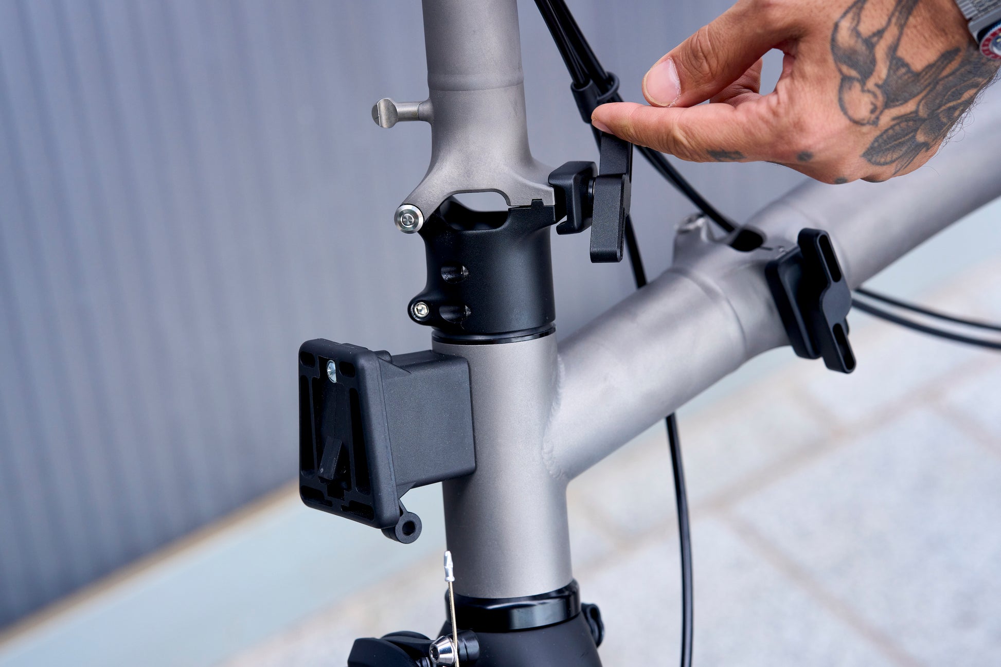 Die Basis für alle Brompton Front-Taschen, passend für Brompton T Line. Der Trägerblock wird am Rahmen befestigt und erlaubt ein unkompliziertes Befestigen aller Taschen.